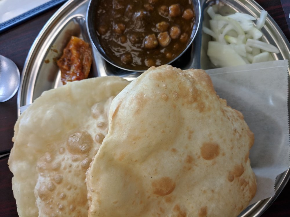 A flavorful combination: Channa Bhatura consists of a spicy chickpea curry (Channa or Chole) served with deep-fried leavened bread called Bhatura.